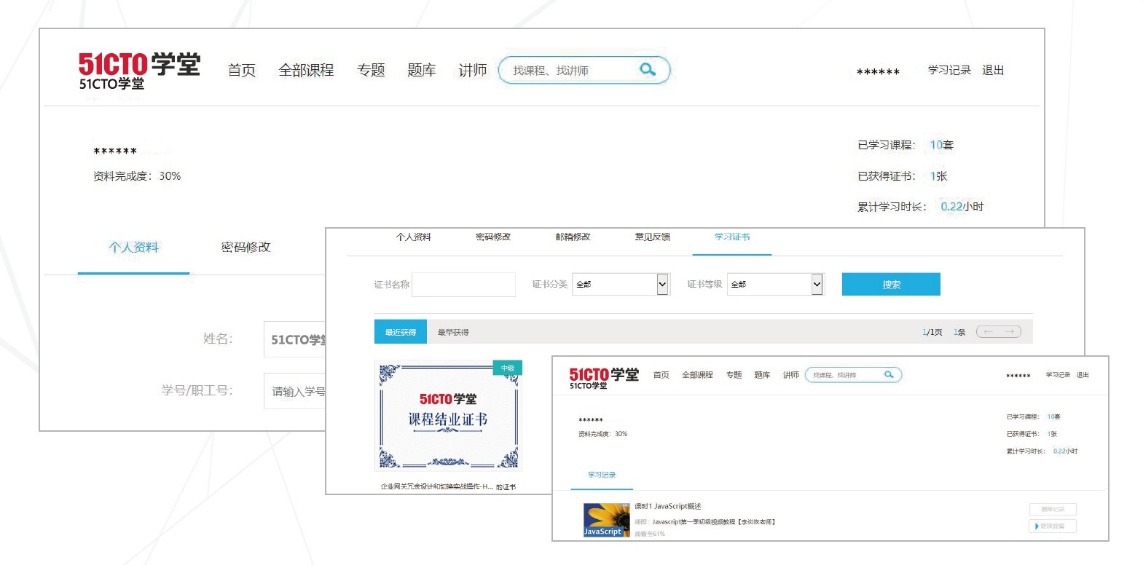 《51CTO学堂》(http://e-learning.51cto.com/)作为专业的数字化人才学习平台,致力于为高校师生提供优质、专业并极富实战性的在线课程。目前,《51CTO学堂》已拥有由数百位优质讲师打造的上万门视频课程,覆盖后端开发、IoT物联网、运维、云计算、办公应用、网络技术、AI人工智能等众多主流信息技术领域,既可以满足学生在数字化技能方面的学习需求,助力其考试认证及就业,也可以为教师开展课程建设和混合式教学提供内容支持。